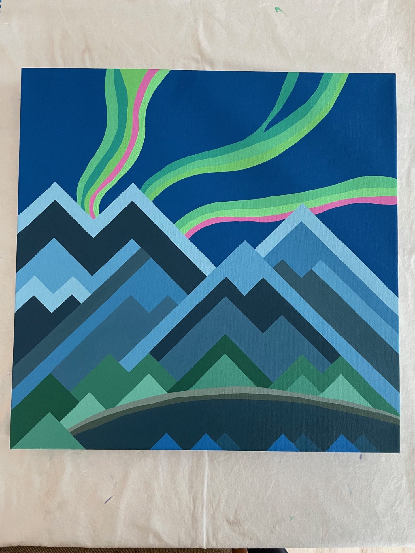 Erin’s Instagram page (@mountainheartstudios) offers a vivid look at her creative journey—one rooted in natural landscapes, thoughtful textures, travel-inspired motifs, and mindful material choices. Her work often combines recycled paper, watercolor fragments, threads, and fabric to build layered compositions. These pieces evoke travel experiences (for instance, ice and mountain motifs), while also referencing her Midwest base in a quiet, reflective way. Erin engages with material in a tactile fashion — her art isn’t just about the image but the process: stitching, layering, collage, printmaking. The result feels meditative yet energized, intimate yet expansive.
