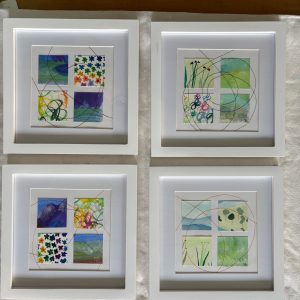 Mixed-media collages built from recycled paper, thread, and watercolor fragments, reflecting her interest in texture and materiality.